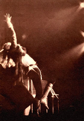 After Jeffrey announces the 'news flash', a flash-bomb explodes at the front of the stage, half-blinding the audience.