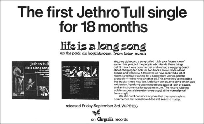 Yes, they did record a song called 'Lick your fingers clean' earlier this year, but the people who decide these things didn't think it was commercial and we had a nagging doubt about charging ten bob for two tracks, so we made a lame excuse and withdrew it. However, we have received a lot of letters specifically asking for a single from Jethro, and the group decided to have another go. This time they've recorded five tracks: three new Ian Anderson songs, one song which was written for Aqualung but not used because of lack of space, and an instrumental for good measure. The record is being sold in a special sleeve (on every copy) at the normal price for a single.