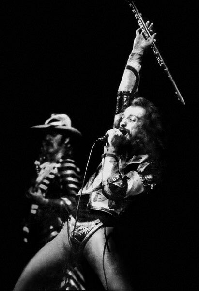 From stage left: Jeffrey Hammond-Hammond, with zebra black-and-white striped overcoat and trousers and guitar and double bass, strong focal point / Barriemore Barlow on drums and wearing red shorts / Ian Anderson in a sort of period costume, multi-coloured, playing flute, alto sax, battered acoustic guitar, singing, ruling the stage / Martin Barre on guitar, the butt of Anderson's jokes, unsmiling, tortuous facials, great soloist / John Evan on piano between futile leaps around stage which are aimless and impress nobody / Adequate pianist, spare personality.