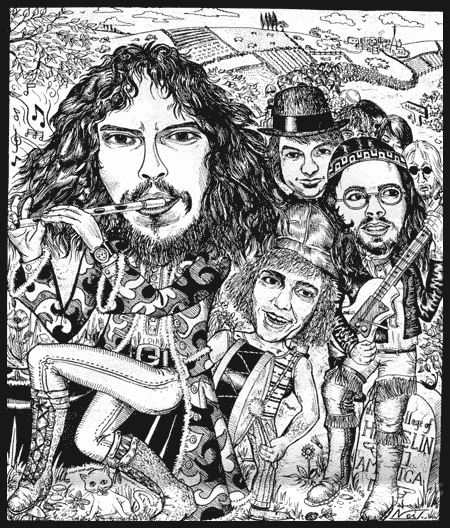 Neil Smith sees Ian Anderson as a pop Pied Piper of Hamelin leading the mesmerised multitude with his hypnotic flute playing and his amazing dancing legs. Clive Bunker, of the bramble bush hair, bangs a drum while Glenn Cornick, the smiling one, smiles on bass. A hatted Martin Barre, lead guitarist, peers enigmatically from the year. (But surely that isn't a corn field behind them. Must be a fertile pasture, at least!)